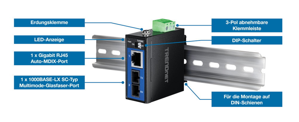 Der gehärtete industrielle 1000BASE-LX Multi-Mode SC-Glasfaserkonverter TI-FGSC des kalifornischen Herstellers Trendnet wurde für genau solche Szenarien entwickelt. Als Medienkonverter mit IP50-zertifiziertem Metallgehäuse verbindet er Kupfer- und Glasfasersegmente über Distanzen von bis zu einem Kilometer. Die integrierte 1000BASE-LX-Technologie mit 1310 nm Wellenlänge ermöglicht dabei stabile Gigabit-Übertragungen über Multimode-Glasfaser – ideal für Gebäude-zu-Gebäude-Verbindungen und lange industrielle Strecken